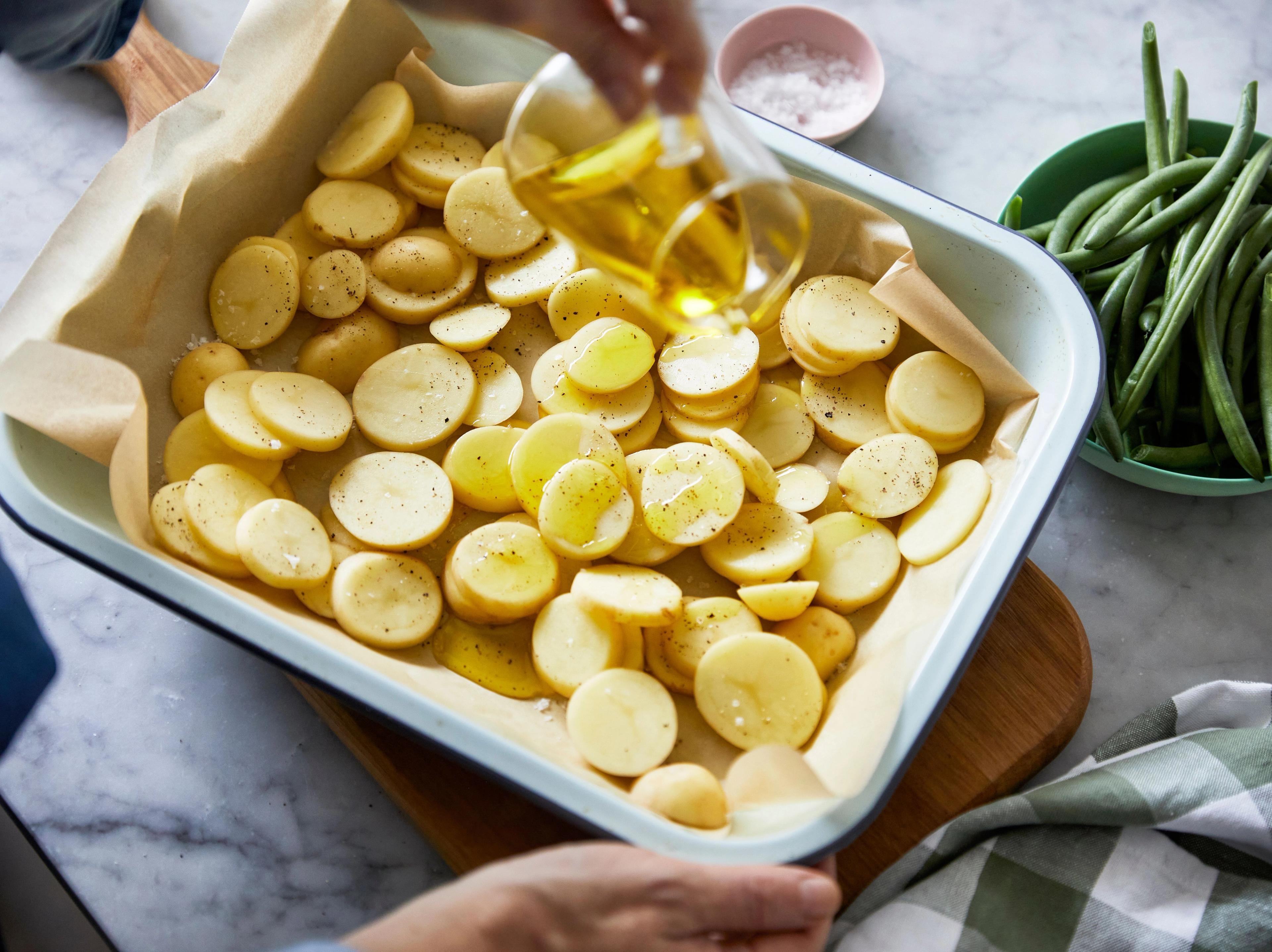 How they can help: mixing the marinade and spreading ingredients on the tray. Older children can help slice potatoes, trim beans and use the oven wearing gloves under supervision.