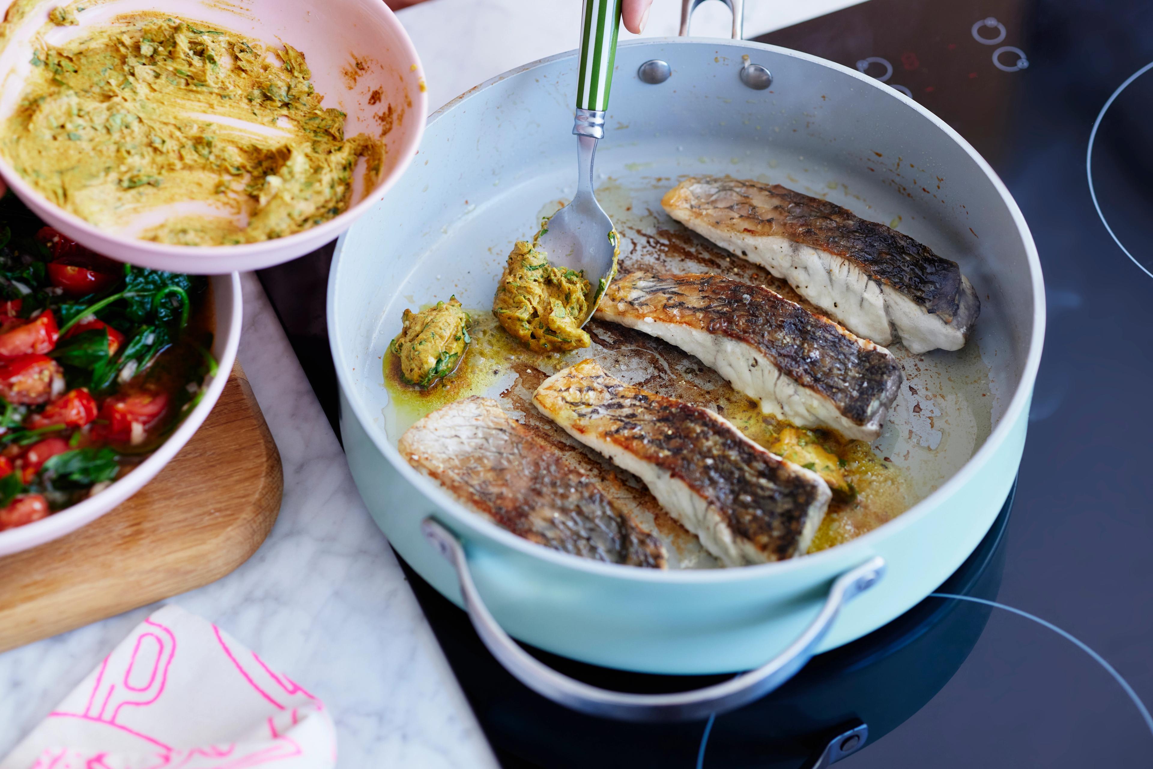 Barra is better buttered with a curry infused sauce for a weeknight flex of fast flavour. There's really nothing like a pan sauce to access that easy-won wow factor. Go ahead and serve these fish fillets with rice and some pan-wilted and well-dressed cherry toms for extra freshness.